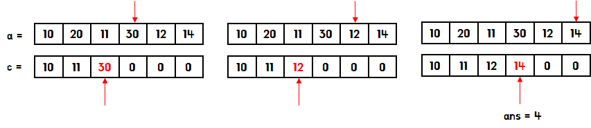 그리고 a의 첫번째 값부터 시작하여 c에 아무 값이 없거나 가장 최근에 들어온 값이 a의 현재 위치의 값보다 작으면 c의 다음 빈칸에 넣어줍니다.